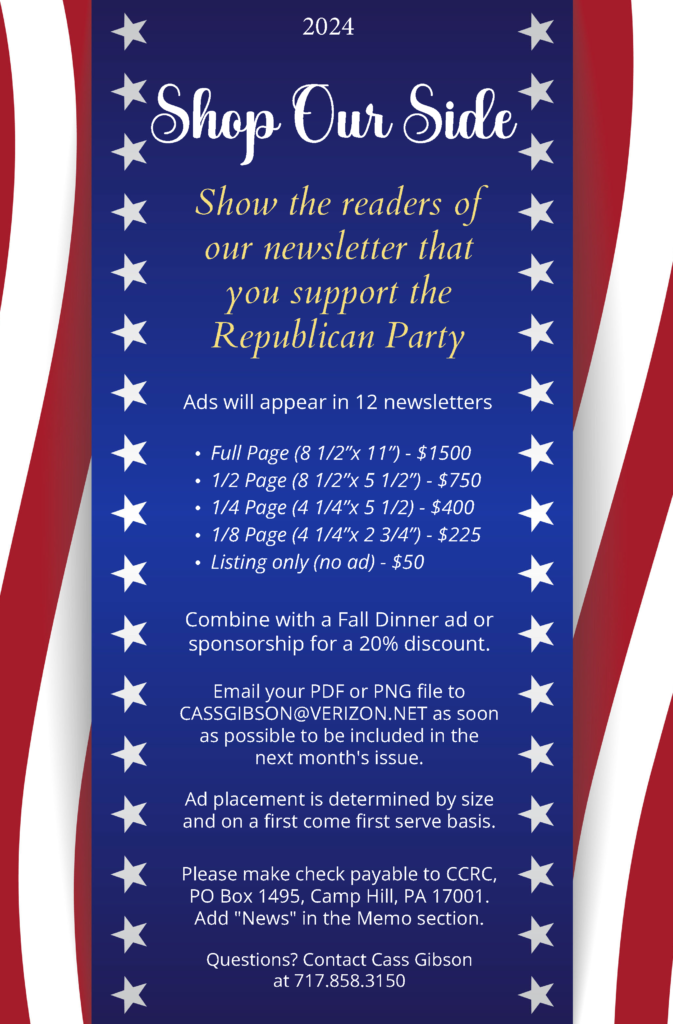 Show the Cumberland County Republicans that you support the Party, so we can support you. See advertisement options below and contact CassGibson@verizon.net to get into the next CCRC Newsletter or Events Calendar.